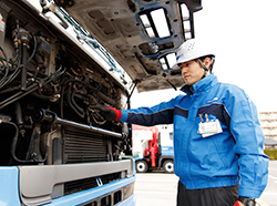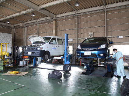 輸送の安全性確保と迅速な点検・整備のため、民間車検工場を本社に併設しています。トラックをはじめ、フォークリフト、社用車、自家用車など多種多様な車両を熟練したスタッフが厳しい基準により点検・整備し、安全性の確保に努めています。